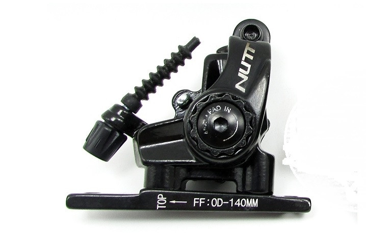 Гальмо дискове механічне NUTT S-6T. Для шосейних велосипедів, циклокроссів і гравійників. Стандарт кріплення FLAT MOUNT. Призначений для роботи з шосейними гальмівними ручками типу "дуали". Відмітна особливість каліпера є двостороннє підведення колодок до ротору під час гальмування, що забезпечує кращу модуляцію та гальмівну потужність, порівнюючи з більшістю класичних, механічних дискових гальм. Також ця конструкція забезпечує рівномірний знос колодок. Литий алюмнієвий корпус.
